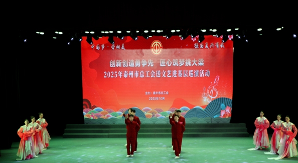 10月27日下午,泰州市总工会、姜堰区总工会、姜堰区文化馆共同举办“创新创造勇争先 匠心筑梦挑大梁”2025年泰州市总工会送文艺进基层巡演活动暨“九九重阳节 浓浓工会情”姜堰职工文艺展演活动。98家基层工会退休老职工、一线职工代表欢聚一堂,品味重阳温情,感悟匠心传承。